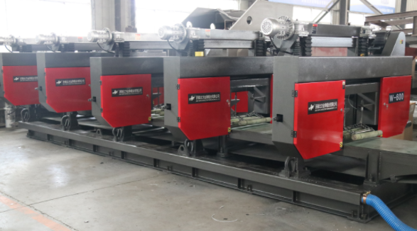 W-600金屬帶鋸床是一款根據客戶要求定制的非標帶鋸床,其采用臥式橫切結構,是在工業鋸切中用于水平鋸切纖維板的設備。W-600帶鋸床的五個機頭之間的距離是經過科學測量好的標準距離,很好的實現了一塊纖維板同時鋸切成五片薄片的過程,且采用傳送帶傳送工件,提高了鋸切效率和鋸切精度,是批量下料的理想設備。