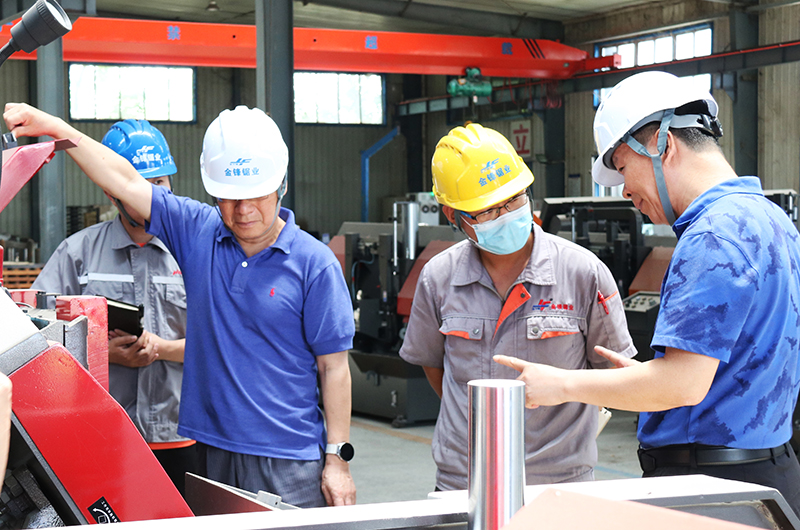 在公司第一會議室,金鋒鋸業(yè)總經(jīng)理劉慶春、總工郭傳鑫和技術(shù)研發(fā)團隊向三位教授匯報了公司帶鋸床、帶鋸條研發(fā)生產(chǎn)情況,并詳細介紹了世界鋸切行業(yè)前沿技術(shù)與產(chǎn)業(yè)動態(tài)。雙方就智能高速鋸切新技術(shù)及鋸床產(chǎn)業(yè)升級話題展開了如火如荼的研討。教授們抓住帶鋸床帶鋸條鋸切材料性質(zhì)、進給模式、負載數(shù)據(jù)傳導(dǎo)、齒形齒角、震動抑制等具體鋸切難題給予了詳細分析和指導(dǎo)。隨后,他們深入到生產(chǎn)裝配一線,細心查看,精心指點,知無不言,言無不盡,盡顯專家風(fēng)范。