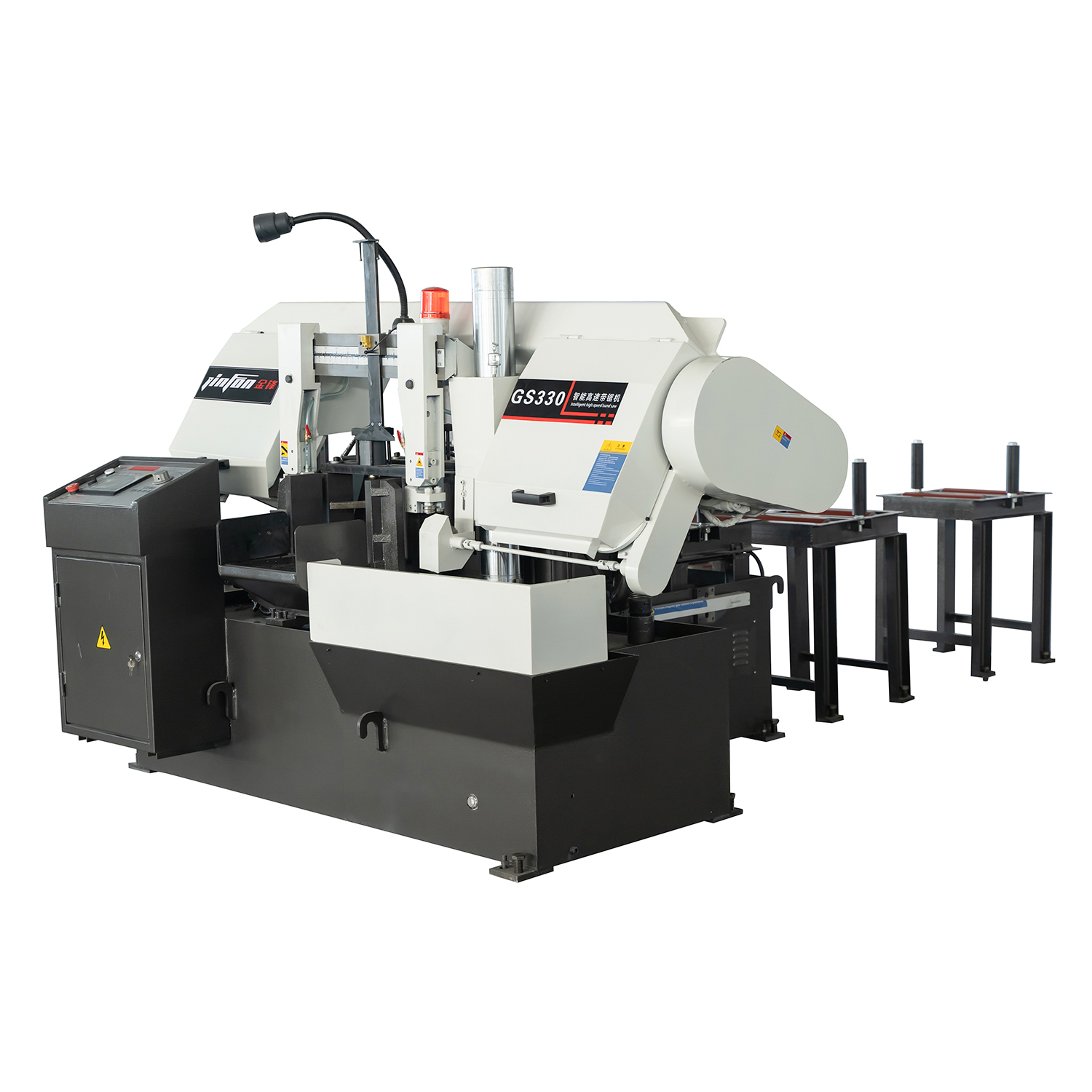 金鋒鋸業生產的GS330為臥式結構、PLC控制、智能全自動數控系統、彩色觸摸屏操縱,GS330智能數控帶鋸床的多模式智能人機界面取代了傳統按鍵,可自由調節手動與自動雙功能選擇、自由調整鋸切參數、自由選配任意長度料架,GS330智能數控帶鋸床采用光柵尺控制送料,可增加激光切割線指示器,鋸床的定位精度高、切割精度高、切割效率高,自動批量切割效率是手動的4倍以上。