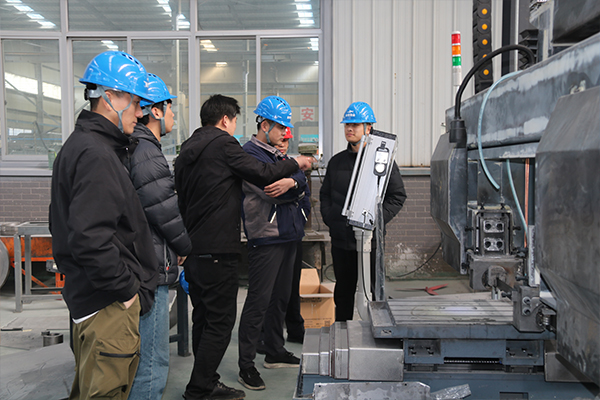 郭總首先從帶鋸床的不同類型、結構原理以及不同類型帶鋸床的性能特點、重要技術參數入手,用多年的工作經驗和通俗易懂的語言進行了詳細解說。為了使新員工更直觀地理解帶鋸床工作原理,郭總還讓相關技術人員啟動機器,親自上手實操,并對帶鋸床運行的相關步驟進行了重點講解和示范。