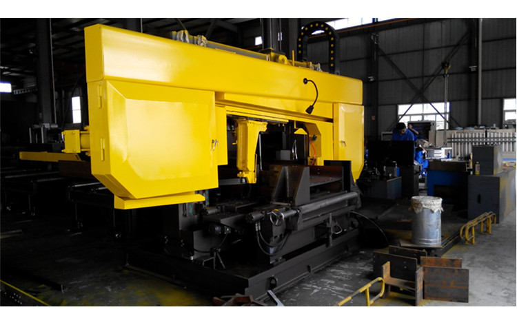 H型鋼是一種常見于建筑和工程用鋼材,因其橫截面形狀類似于字母“H”而得名。它由兩個平行的翼緣和中間的腹板組成,結構強度高,重量輕,廣泛應用于鋼結構建筑、橋梁、廠房、機械支撐等領域。金鋒鋸業為滿足建筑行業對H型鋼鋸切的需求,生產了旋轉角度帶鋸床。因為H型鋼的特殊結構在實際工程中需要斜切、角度切割或復雜截面加工,旋轉角度帶鋸床可靈活矯正角度,適應復雜結構切割,是H型鋼鋸切的理想設備。