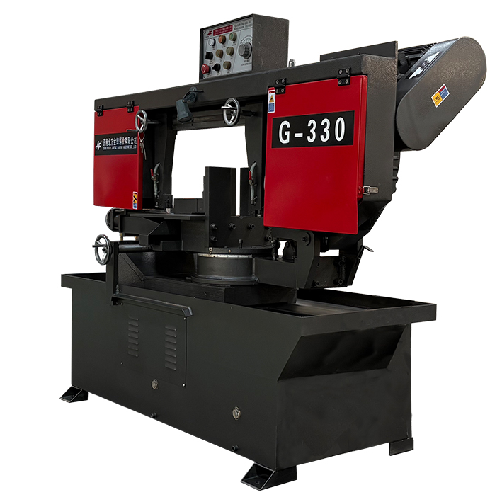 G330角度鋸床作為旋轉角度帶鋸床的代表,一直備受國外客戶青睞。鋸床為剪切式結構,引進和吸收國外同類鋸床的性能特點,配備液壓平衡油缸,高強度平衡彈簧及液壓無極調速系統。在鋸切時,鋸架可正向旋轉0°—45°或反向旋轉0°—60°,適應鋸切有角度要求的角鋼、圓鋼、矩形管等。